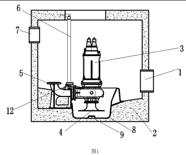 圖中:1-進水管、2-井式泵站、3-泵、4-虹吸管、5-出水支撐座、6-導向桿、7-出水